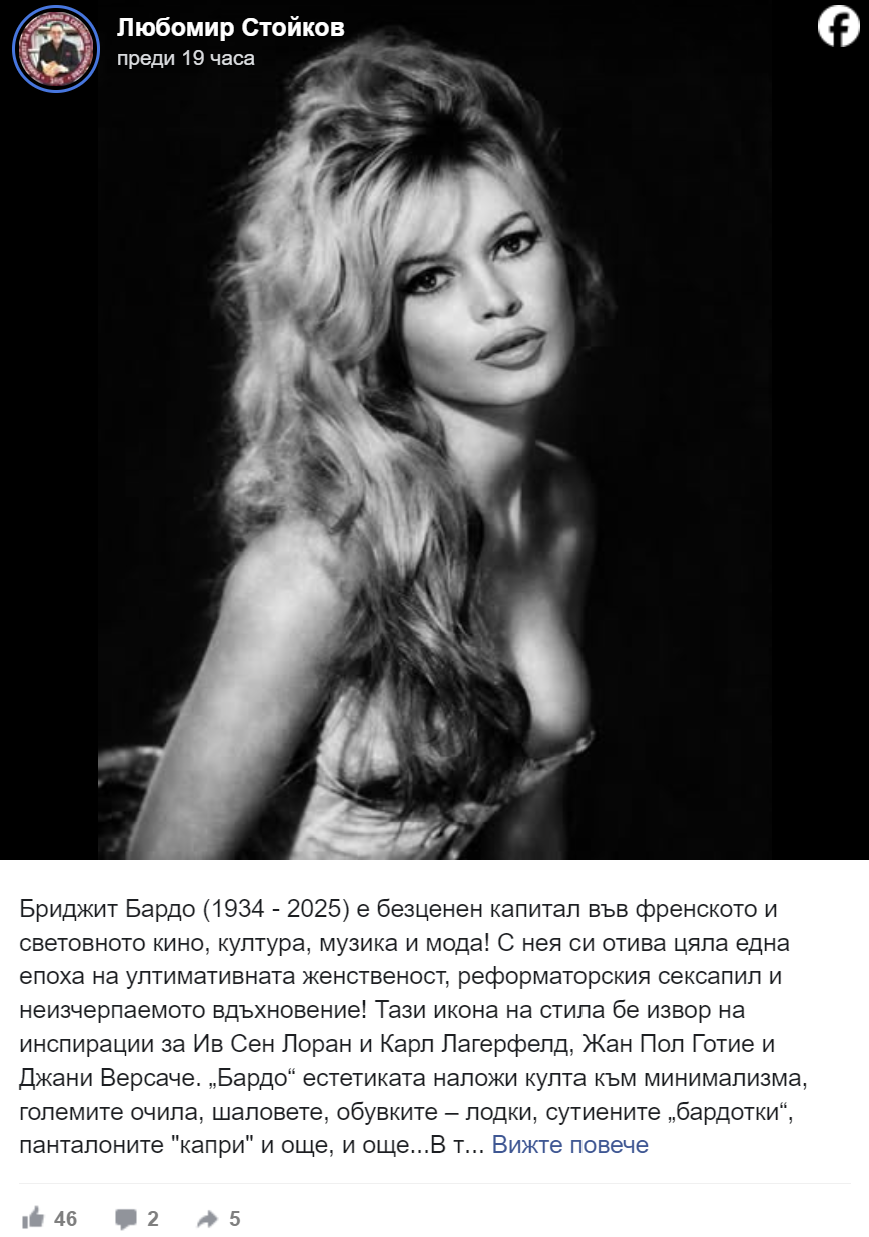 По повод кончината на великата актриса, известният културолог, изкуствовед, журналист и университетски преподавател проф. Любомир Стойков сподели: „Бриджит Бардо е безценен капитал във френското и световното кино, култура, музика и мода! С нея си отива цяла една епоха на ултимативната женственост, реформаторския сексапил и неизчерпаемото вдъхновение! Тази икона на стила бе извор на инспирации за Ив Сен Лоран и Карл Лагерфелд, Жан Пол Готие и Джани Версаче. „Бардо“ естетиката наложи култа към минимализма, големите очила, шаловете, обувките – лодки, сутиените „бардотки“ и още, и още… Още в тийнейджърските си години се възхищавах не само на зашеметяващото ѝ еротично излъчване, но и на актьорската ѝ игра във филмите „И Бог създаде жената“, „Бабет отива на война“, „Петролотърсачките“, вдъхновявах се от красотата и дръзкото й поведение, а по-късно и от мащабната й социална кауза за защита правата на животните! Бриджит Бардо бе и ще продължава да бъде символ и идол на редица генерации както със своята красота, харизма и влияние, така и с волята си да се издигне над баналната суета, над празния лукс в името на най-значимите духовни и човешки ценности! Тя бе уникален феномен и затова заслужава най-дълбок поклон! Бриджит Бардо е завинаги!“.