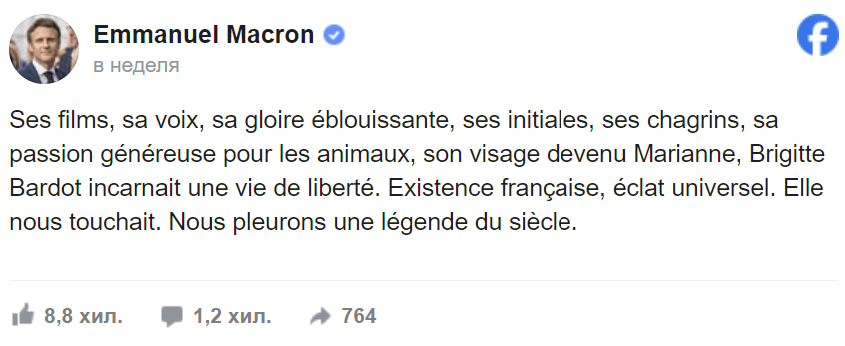 Френският президент Еманюел Макрон също публикува емоционален пост в социалните мрежи, с който почете иконата: „Нейните филми, нейният глас, нейната ослепителна слава, нейните инициали, нейната тъга, нейната щедра страст към животните, нейното лице, което се превърна в Мариан, Бриджит Бардо въплъщаваше свободния живот. Френско съществуване, всеобщо сияние. Тя ни докосваше. Скърбим за легендата на века.“