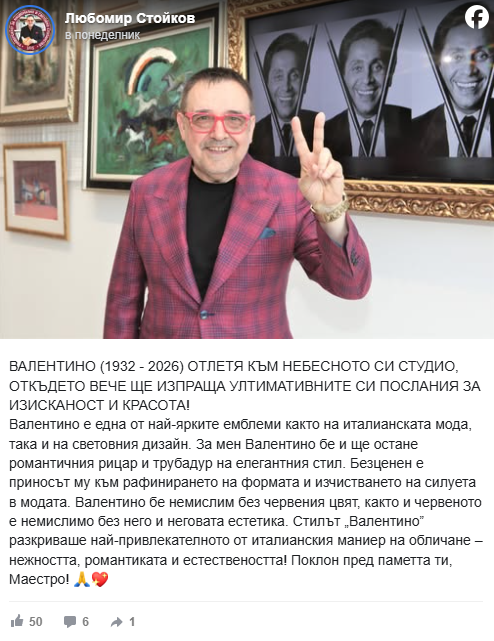Изкуствоведът и културолог проф. Любомир Стойков – председател на Академията за мода, сподели в социалните мрежи: „Императорът на модата Валентино отлетя към небесното си студио, откъдето ще продължава да изпраща ултимативните си послания за изисканост и красота! Той е една от най-ярките емблеми както на италианската мода, така и на световния дизайн. За мен Валентино бе и ще остане романтичния рицар и трубадур на елегантния стил. Безценен е приносът му към рафинирането на формата и изчистването на силуета в модата. Валентино бе немислим без червения цвят, както и червеното е немислимо без него и неговата естетика. Стилът „Валентино” разкриваше най-привлекателното от италианския маниер на обличане – нежността, романтиката и естествеността! Поклон пред паметта ти, Маестро!“.