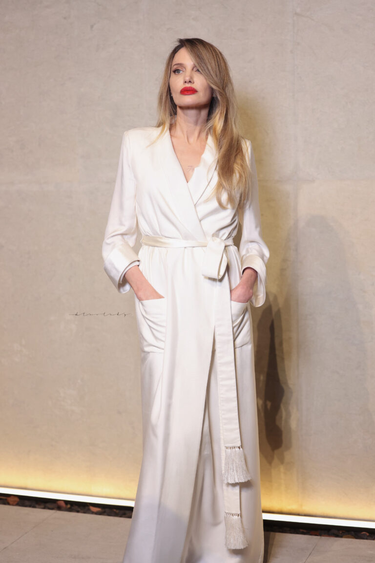 Анджелина Джоли отново накара всички да говорят за нея при появата ѝ на събитие на „Том Форд“ в рамките на Седмицата на модата в Шанхай. Белият ѝ тоалет беше от колекцията на бранда за пролетта на 2026 г. с подписа на Хайдер Акерман и впечатляваше с мека материя, обърнат ревер и дълбоко деколте. Копринени джобове допълваха елегантния силует с леко драпираната конструкция.