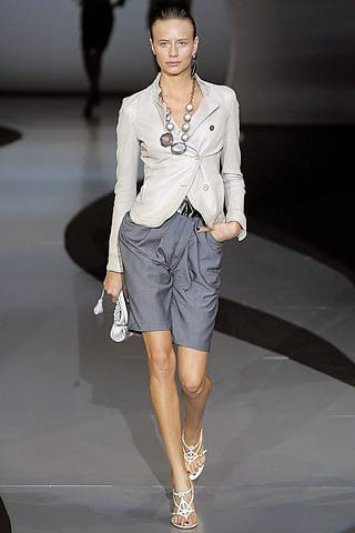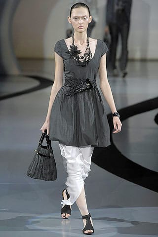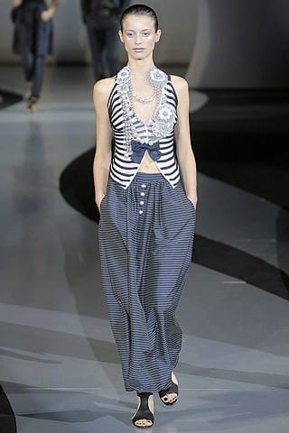 Колекцията на “Емпорио Армани” пролет-лято 2009 е посветена на леките панталони – тенденция, която Джорджо Армани усъвършенства от години. За този сезон италианецът предлага удобни, широки панталони, стеснени в глезена, и широки около ханша. Дръзко модно предизвикателство са леопардовите шорти, които се носят над панталона от костюма. Тенденцията “Изтокът среща Запада” налага оригинални якета с китайски яки. Любопитен детайл: едни и същи облекла вече могат да се носят както през деня, така и вечер. За по-специални случаи Армани препоръчва обемен смокинг, обсипан с кристали. Цветовете на сезона са бебешко розово, бебешко синъо, жълто; тонове, подобни на скъпоценни камъни.