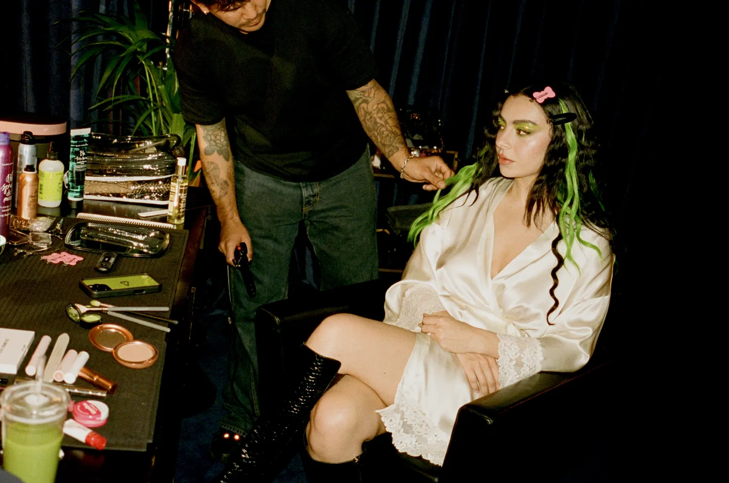 Чарли Екс Си Екс е известна със своите емблематични къдрици, но в The Moment косата ѝ не е просто естетически акцент. Тя се превръща в огледало на вътрешното ѝ състояние – от уверен творец до артист на ръба на прегарянето. Виждаме плешиви участъци, резултат от постоянно опъване за „лифтинг“ ефект, бухнали и изтощени къдрици, както и нарочно натрапчиви неоновозелени екстеншъни. Главният коафьор на продукцията е дългогодишният ѝ стилист Мат Бенс, който в типично мета стил се появява във филма като самия себе си, въоръжен с продукти на Bumble and bumble – официален партньор за коса на проекта.