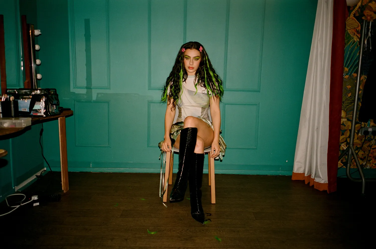 Чарли Екс Си Екс е известна със своите емблематични къдрици, но в The Moment косата ѝ не е просто естетически акцент. Тя се превръща в огледало на вътрешното ѝ състояние – от уверен творец до артист на ръба на прегарянето. Виждаме плешиви участъци, резултат от постоянно опъване за „лифтинг“ ефект, бухнали и изтощени къдрици, както и нарочно натрапчиви неоновозелени екстеншъни. Главният коафьор на продукцията е дългогодишният ѝ стилист Мат Бенс, който в типично мета стил се появява във филма като самия себе си, въоръжен с продукти на Bumble and bumble – официален партньор за коса на проекта.