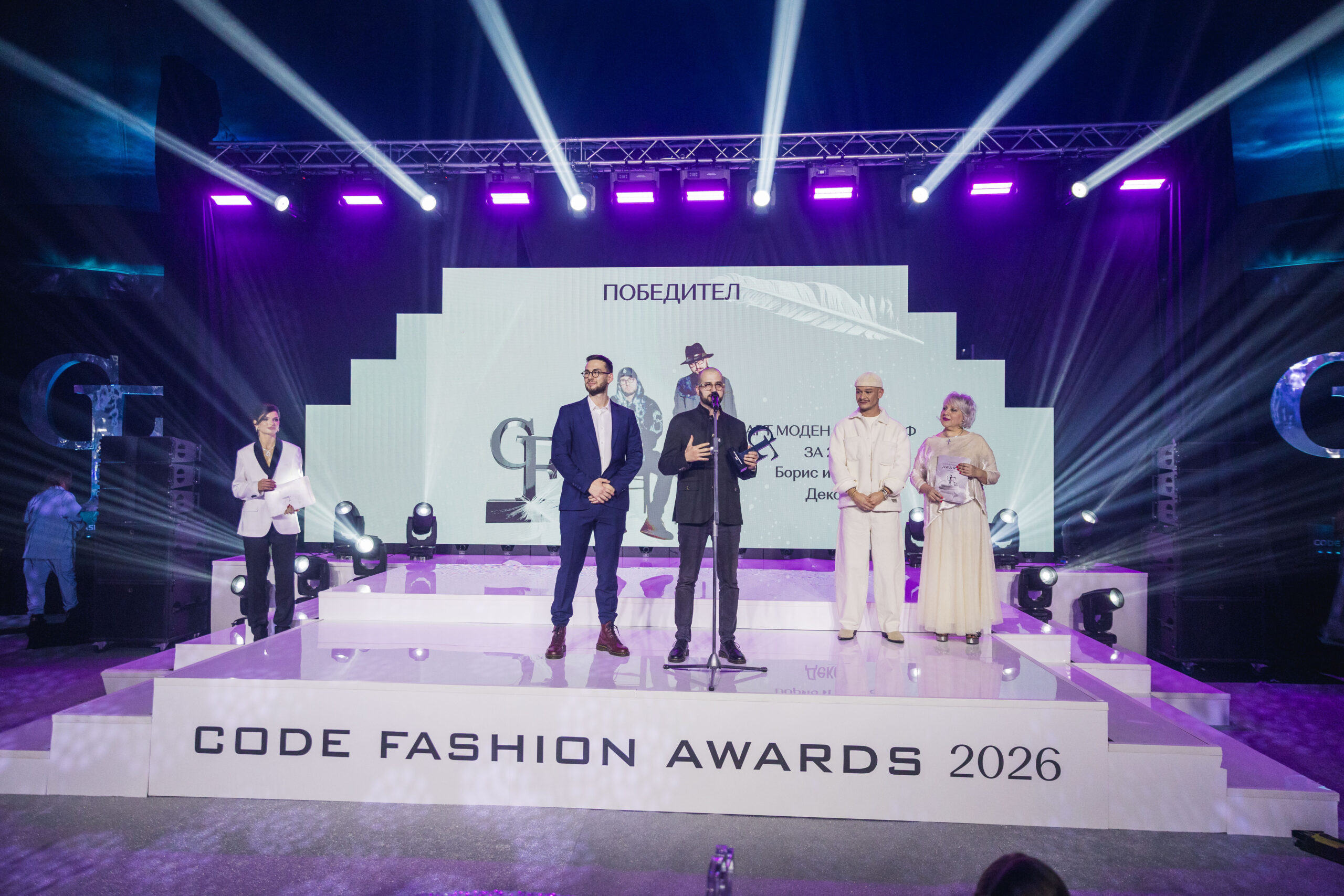 На най-голямата модна сцена в България отличията бяха връчени от победители от предишни издания, инфлуенсъри, ВИП гости и партньори на Code Fashion Awards. Сред най-емоционалните моменти на вечерта бе отличаването на Христо Стоичков, носител на наградата „Бранд на годината“, което бе посрещнато с аплодисменти от цялата зала.