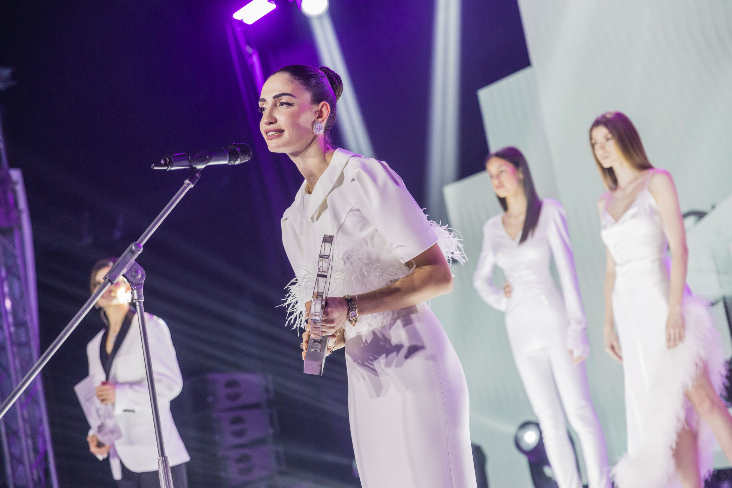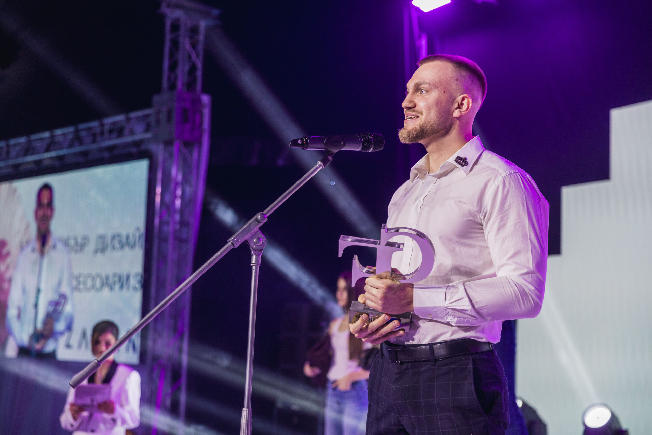 Водещите на церемонията Славена Вътова и Диляна Маринова – Джуджи направиха запомнящо се стилово изявление, появявайки се както в елегантни рокли, така и в стилни мъжки костюми, създадени от AC&co – ясно послание за свобода на стила, индивидуалност и съвременна естетика.
