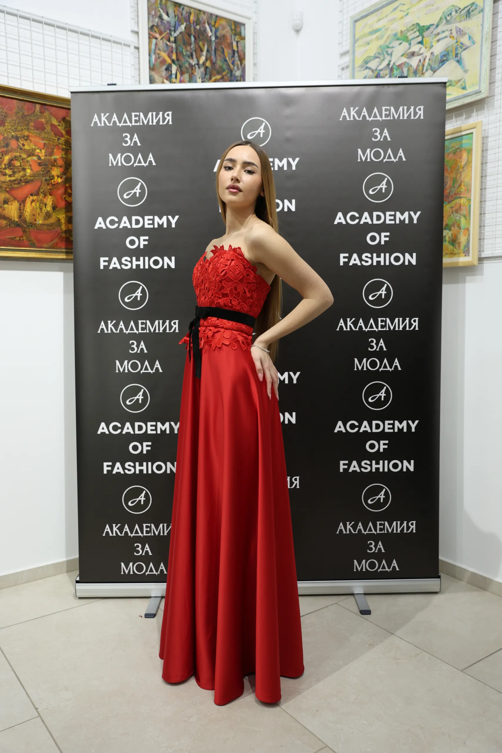 Модното ревю започна с Ивет Бианки – носител на „Изгряваща звезда 2025“ в категория „Международни успехи“ и носител на „Златна игла 2024“ в категория „Най-добър млад дизайнер“. Тя презентира рокля от последната си колекция – в дълбок, наситен червен цвят. Корсетната линия деликатно подчертава силуета, а черният колан с панделка акцентира талията и добавя драматичен контраст.